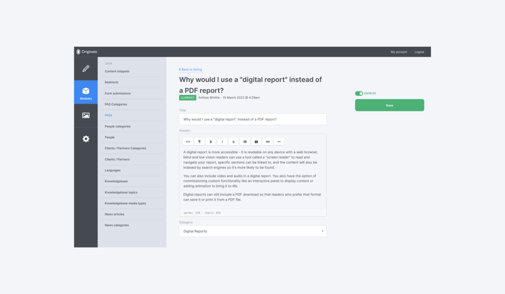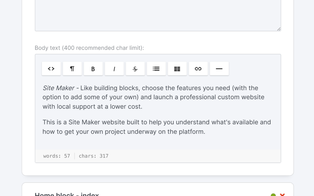When editing articles in the content management system, editors have access to a "What You See Is What You Get" Editor on relevant pages, making it easier for non-technical users to create beautiful content with headings, lists, bold and italic styling without handling any code. Buttons similar to those you use in Word or Google Docs make formatting easy.
