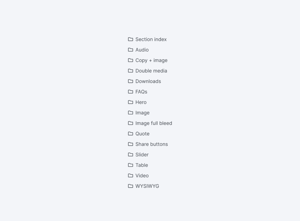 A growing selection of content blocks so content editors can choose how best to present content on a page. These underpin rich and engaging webpages, or present volumes of content to be easily read by users.